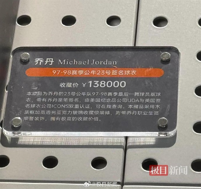 市民郑先生向记者展示的球衣图片显示,该专柜一面墙都是球星的亲签球衣,比如梅西2022年世界杯阿根廷国家队10号球衣、姆巴佩2022-23赛季大巴黎主场7号球衣、贝克汉姆1999年曼联欧冠主场7号球衣等等。其中最贵的当属乔丹1997-1998赛季公牛23号签名球衣,售价138000元,售价最低的是艾弗森1996-1997赛季76人3号亲签球衣,价格为6300元。